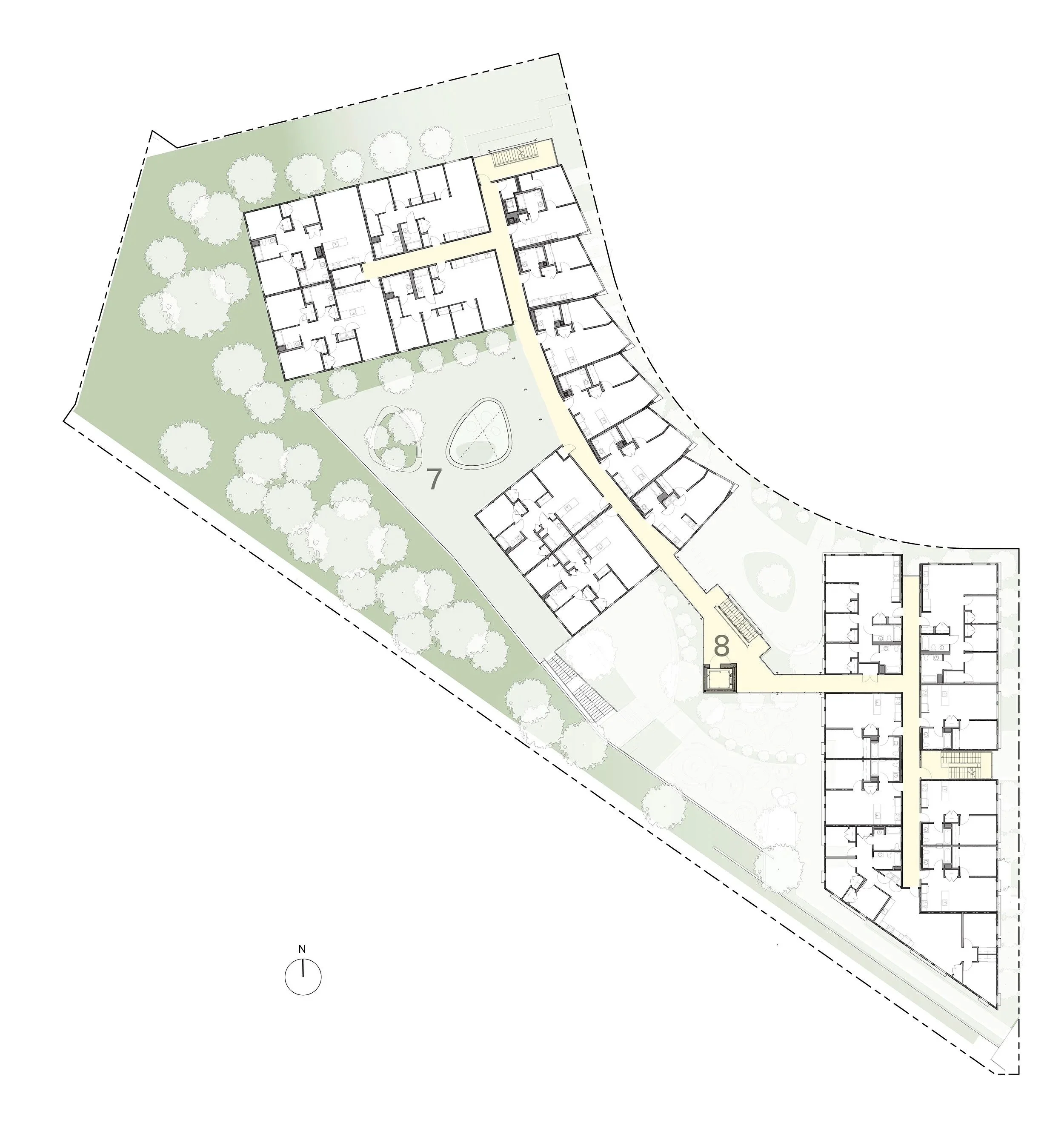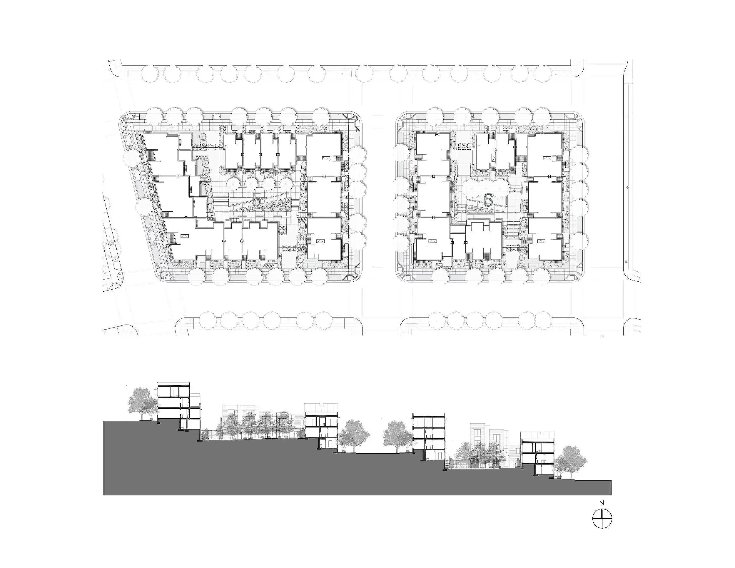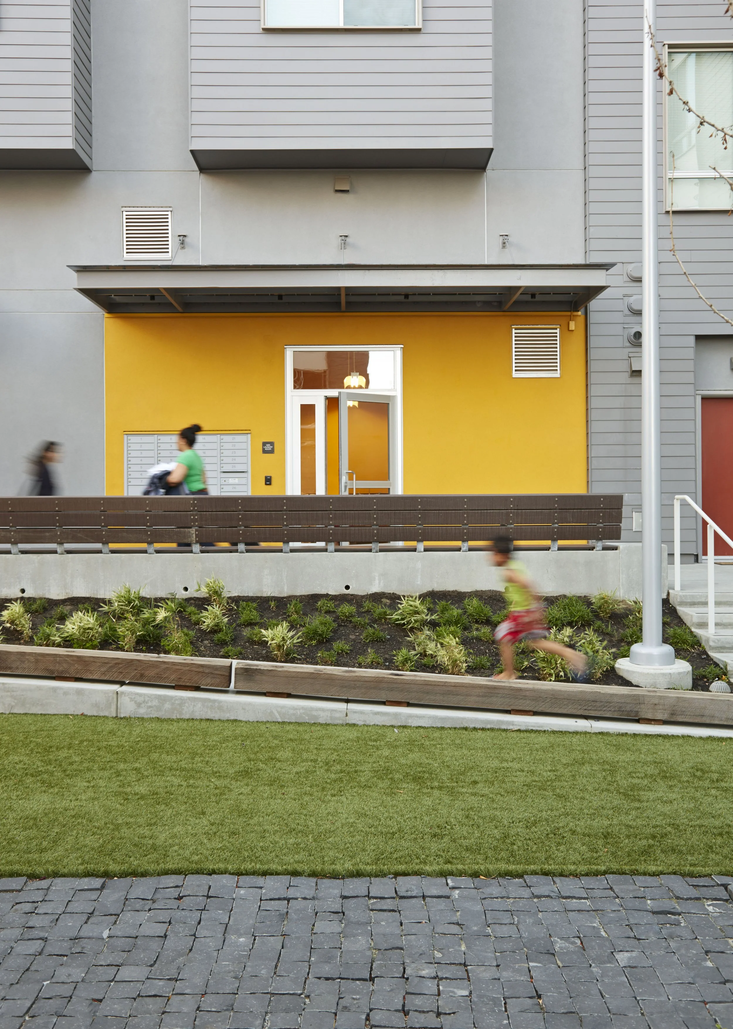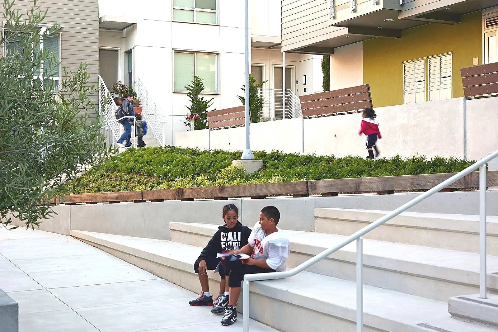 The Block 5 courtyard serves as a hub with steps and ramps that mitigate the sloping site and facilitate informal play and gathering.