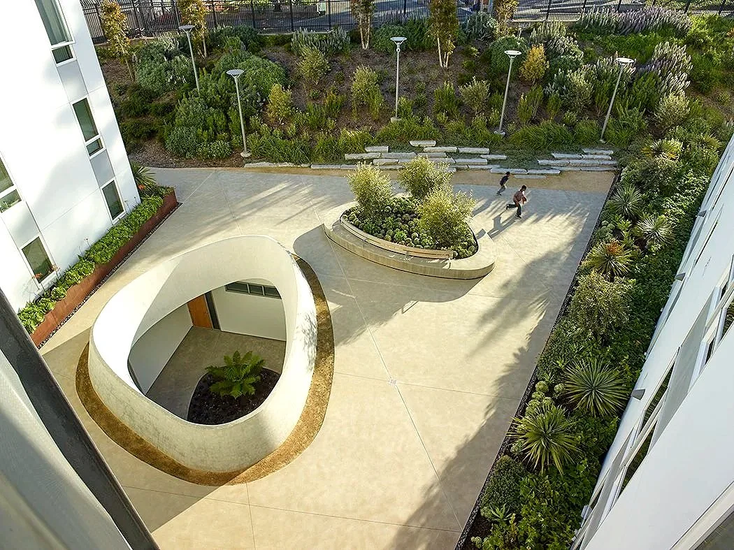 Oculus within the Level 2 resident courtyard provides natural daylight to the community center below.