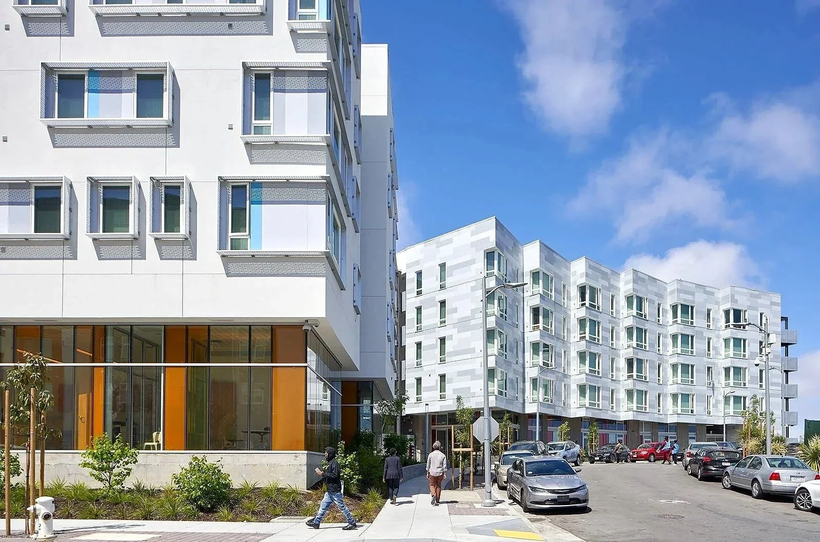 Across a parklet just west of Block 11, Block 10 adds 72 additional new housing units earmarked for low-income individuals and families and serves as a community hub. A two-winged building clad in calming white, Block 10 creates its own public plaza—a central space that provides additional entry points into the residences, community center, and day care within. Inside, community members will also find a fitness room, a wellness center, a recording studio, laundry, and management and service offices. On the ground floor, a facade of colorful glazed panels make for a welcoming gesture, while the serrated form of the upper floors responds to the curve of Fairfax Avenue.
