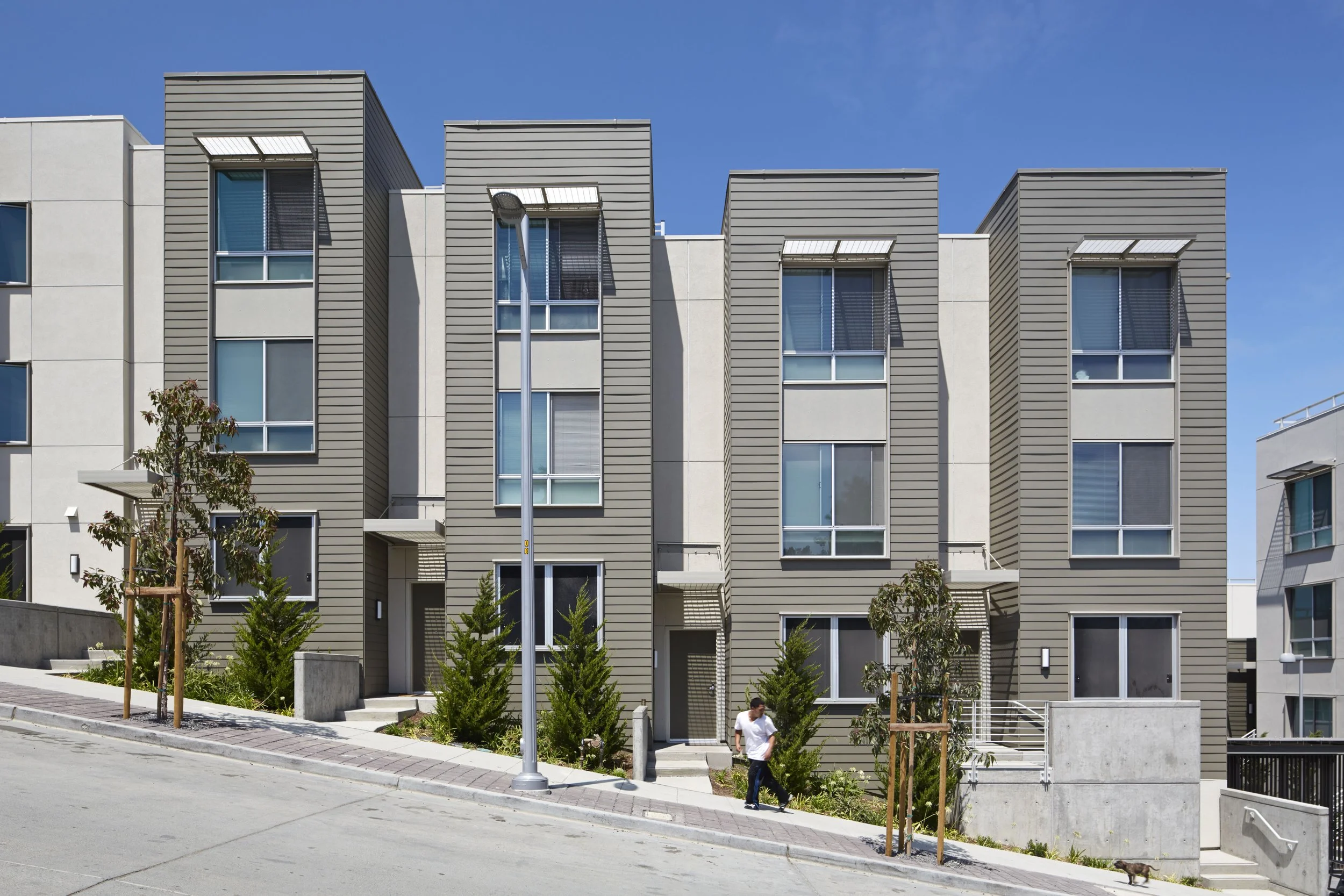 Stacked multi-level units step down the hillside, reminiscent of rowhouse urban patterns of San Francisco.
