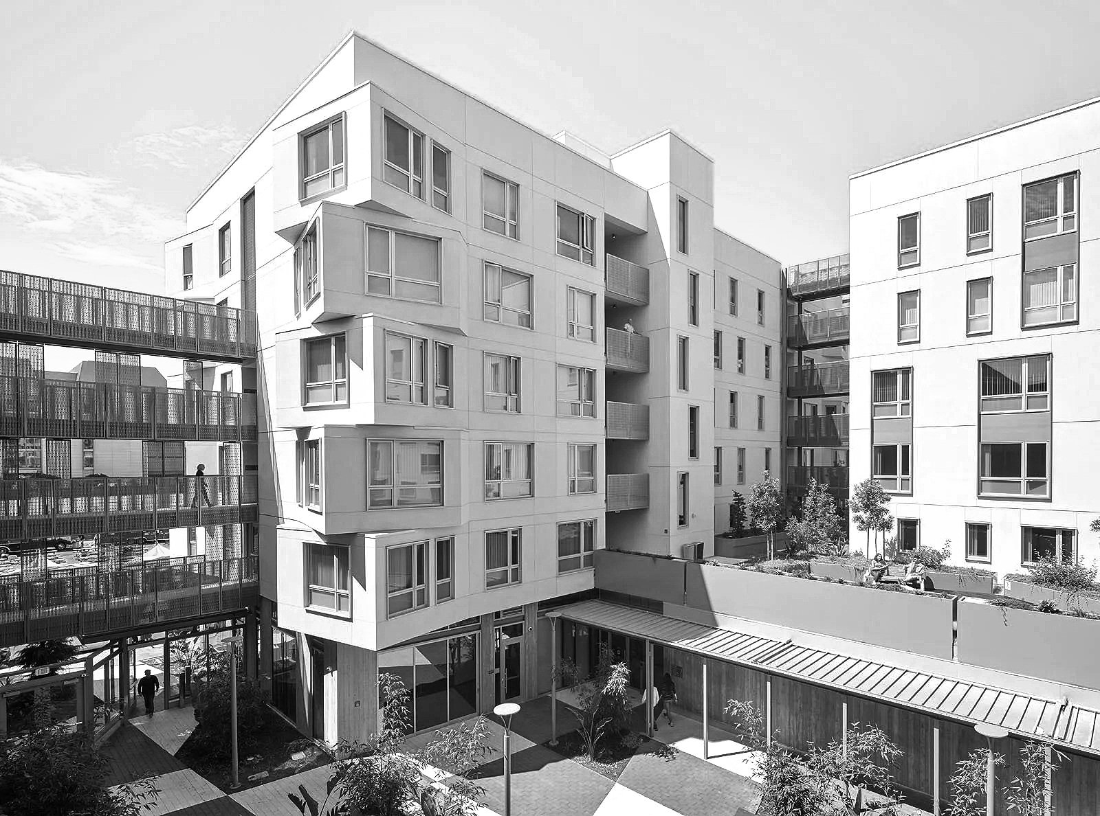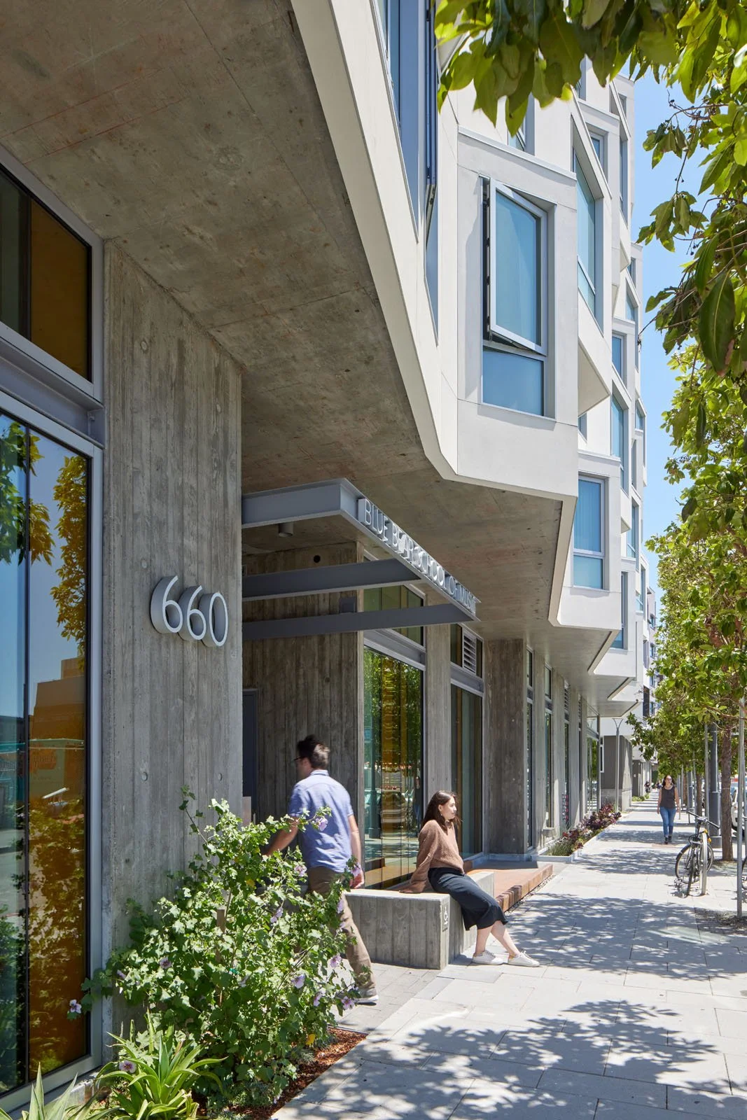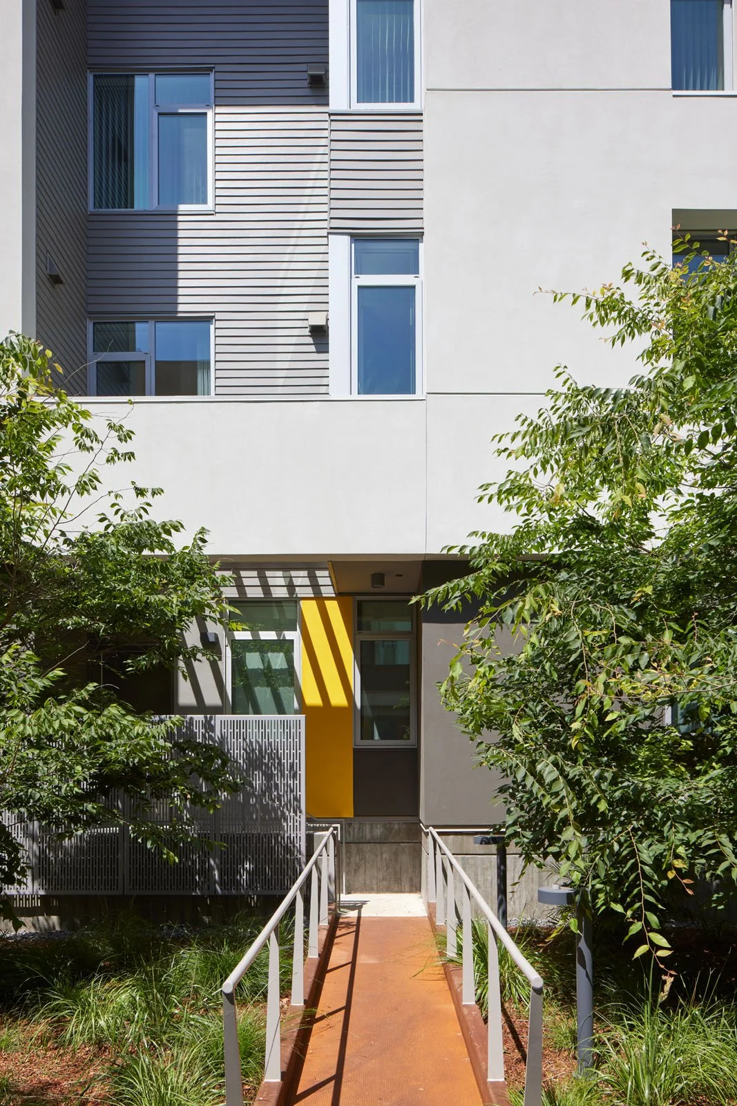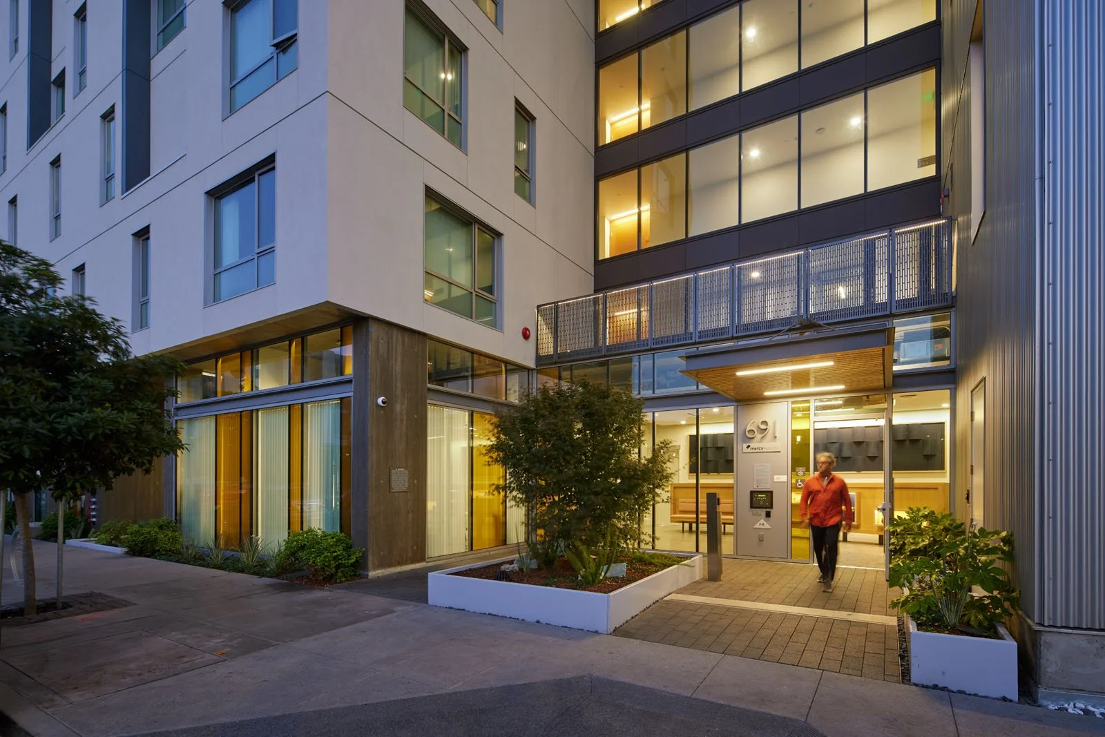 Beyond the development’s exemplary emphasis on community engagement and equity, the seven-story building also exceeds California’s stringent energy standards, gaining GreenPoint Rated Platinum certifications. To achieve this status, we incorporated energy efficient measures into the design from the outset. Photovoltaics offset energy use throughout the building. Inside the units, energy-saving strategies include electric heating and stoves, LED lighting, Energy Star-rated appliances, ample daylighting through generously sized windows, and outdoor circulation with photocell lighting controls. Exposed concrete walls on the south side of the development offer passive thermal cooling and heating benefits, while sunshade formats respond to solar orientation. A fast EV charger in the garage, with all parking spaces being EV capable/EV ready, promotes electric vehicle use, and designated car-share vehicle parking spaces encourage car sharing.