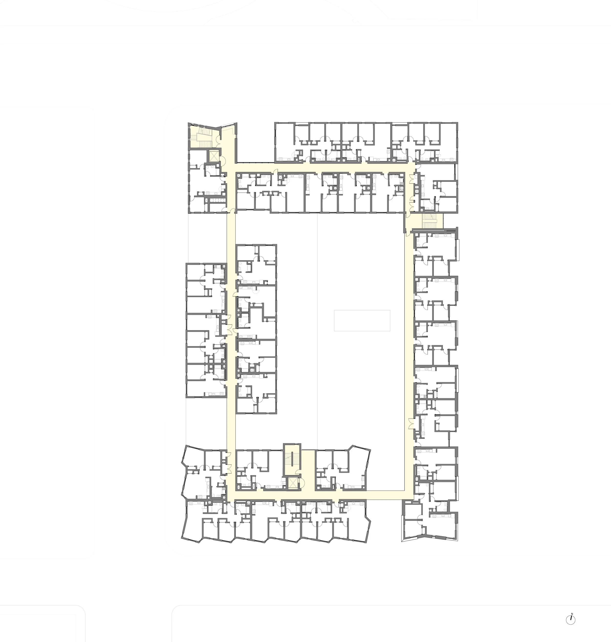 Given the Community’s emphasis on togetherness, we conceived the development as four connected buildings centered around a courtyard planted with age-inclusive and drought-tolerant hardscape and landscape features. The varying scale, materiality, and visual texture of each wing encourage equitable yet distinct micro-neighborhoods. The intimately scaled groupings and four separate identities foster close connections among the residents of each building, a key variable within the 191,000-square-foot development. The entire development is porous with open-air circulation and visual connections to the surrounding neighborhood to further enhance a sense of place and connection, as well as passive ventilation.