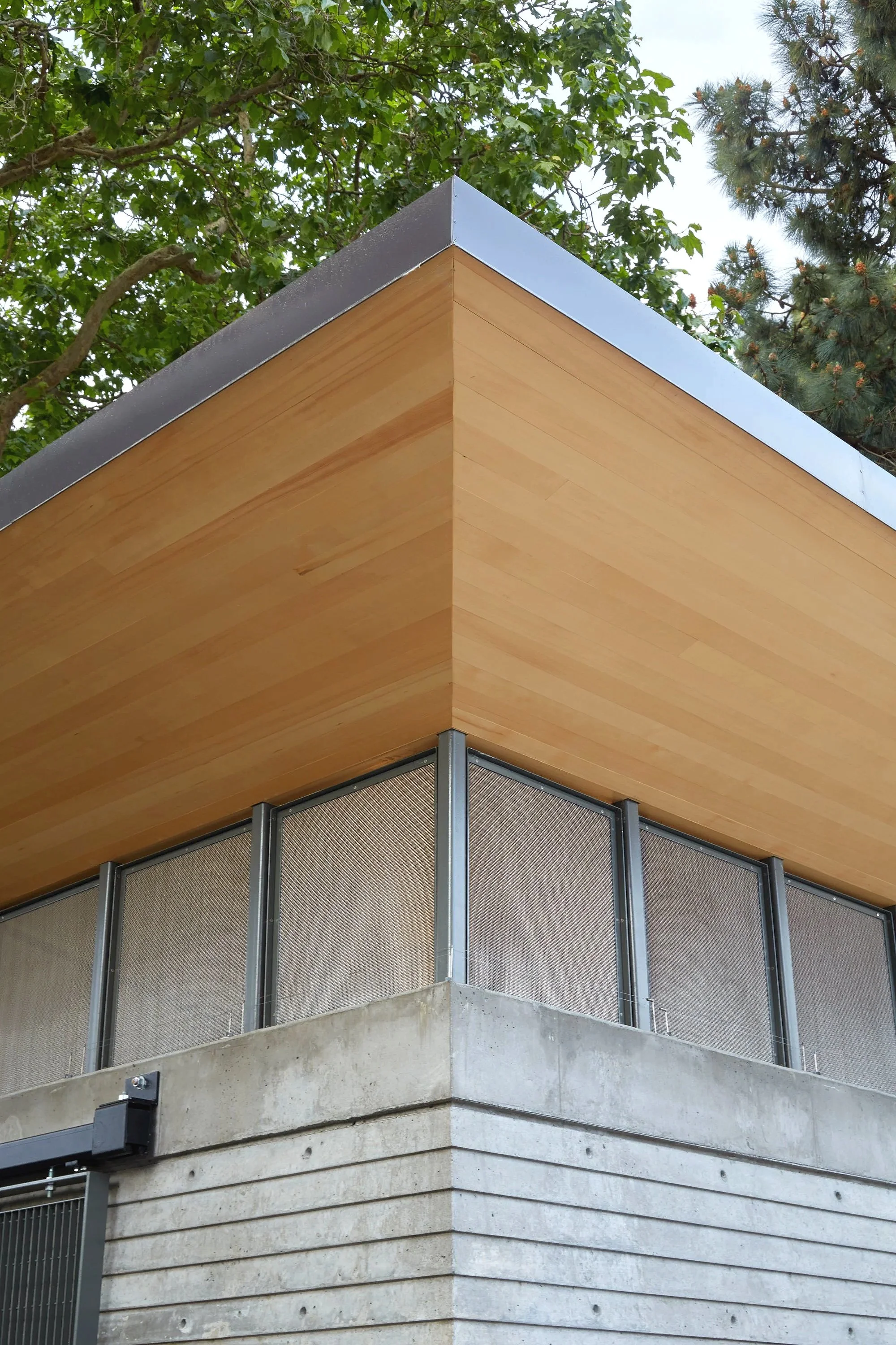 Beneath a sloped overhang, steel gates slide in front of an opening in the concrete structure, creating a protected, recessed entrance to the facility. The lightness of their grate structure plays against the solidity of the textural board-formed concrete walls. The concrete structure is very durable and the shiplap forms soften the feel of the concrete and relate to the residential neighborhood around it. A clerestory above head height provides natural ventilation and daylight, while outdoor lighting directly below enhances visibility in the evening hours. In the evening, light bounces off the wood soffit, providing a warm glow and creating a well lit building perimeter that feels safe. Inside, cornhusk-colored tiles add vibrance, while a cedar soffit lends warmth. As a whole, the structure is a welcoming, safe gesture, thoughtfully finished and designed to last.