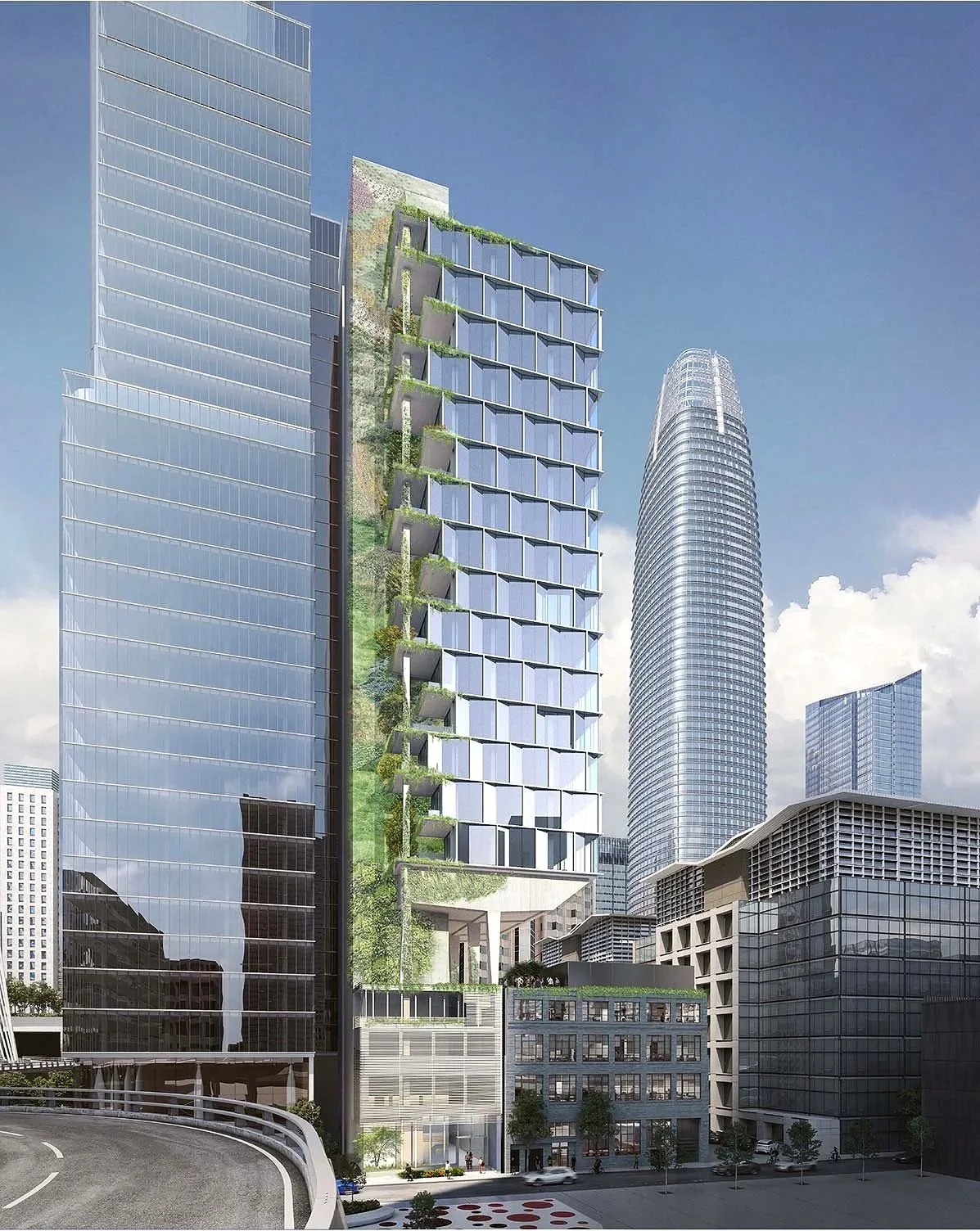 Infilling the adjacent surface parking lot at the podium level, the addition sensitively incorporates office and lab space, while gesturing to the industrial character and massing of the existing building. The facade takes advantage of the site’s visual prominence, its shifting pattern of folded planes of floor-to-ceiling glass appearing to float within an extruded frame. One of the key elements of the design solution was cantilevering the new building from the adjacent empty lot over the existing 543 Howard to allow that building to remain occupied throughout construction. A series of balconies carve into the mass of the tower, connecting at the ground level to a vegetated wall that runs along Tehama Street. This integration with the surrounding environment continues up the height of the tower: as glazing wraps the four sides, it renders the volume reactive to the changing weather, reflecting and refracting light and cloud cover throughout the day.