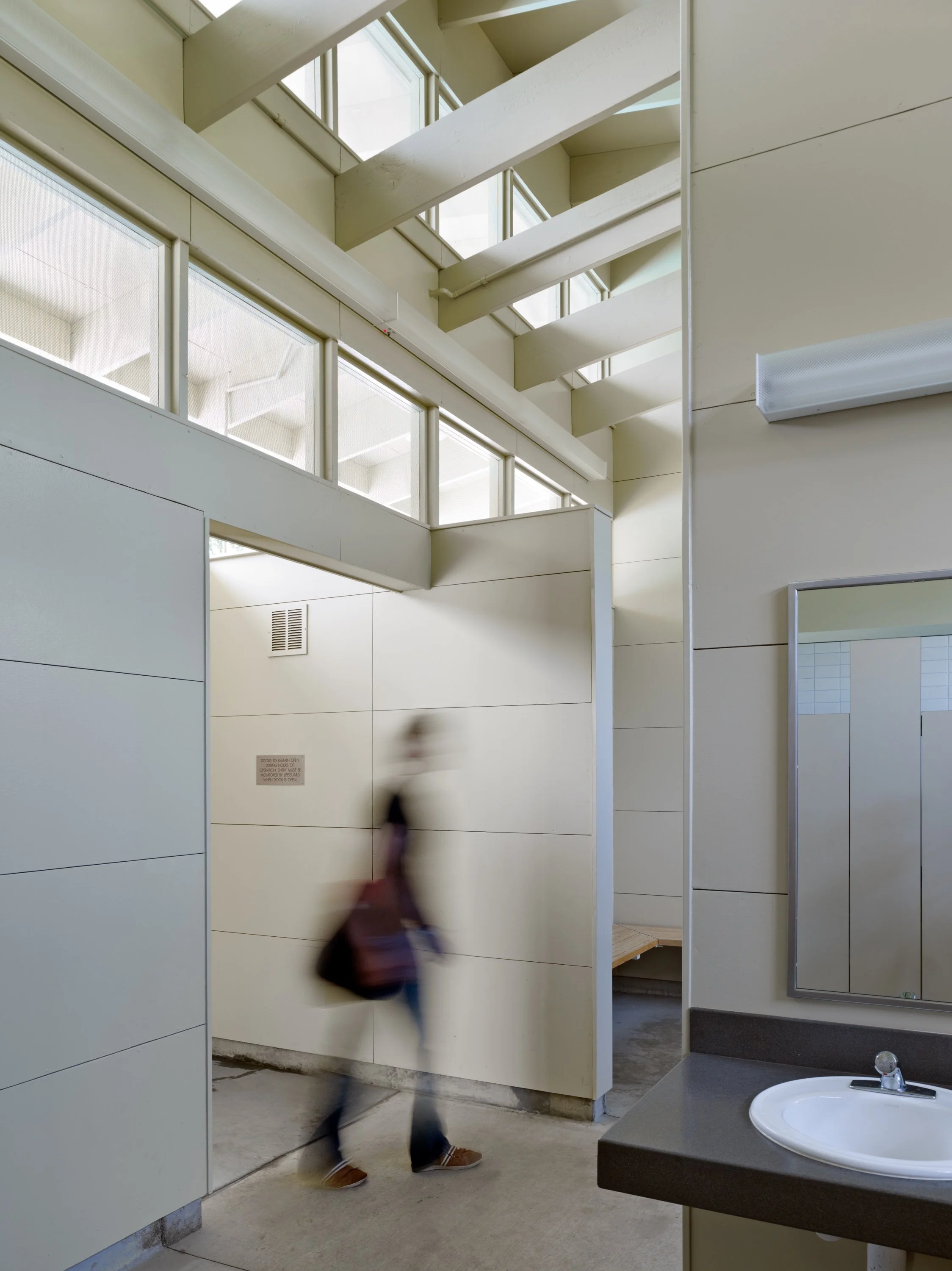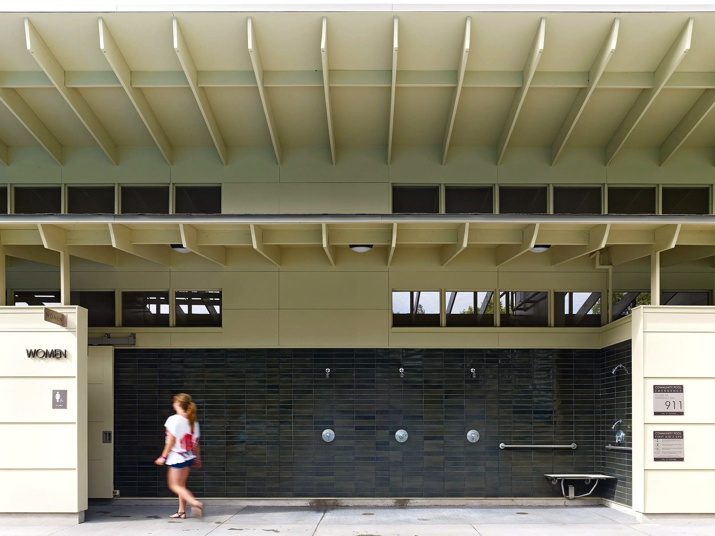 The pools are sited between the new bathhouse and a row of preserved valley oak trees, creating a coherent sense of place. The bathhouse serves as the visual and programmatic gateway to the pool. It’s designed as a covered, open-air pavilion with a butterfly roof to optimize natural ventilation on hot summer days. This passive design strategy substantially reduced construction costs and will save on long-term operational costs by almost entirely eliminating the need for a mechanical system. The second phase will further reduce expenses through the addition of rooftop solar thermal panels and an underground geothermal system to heat both pools.
