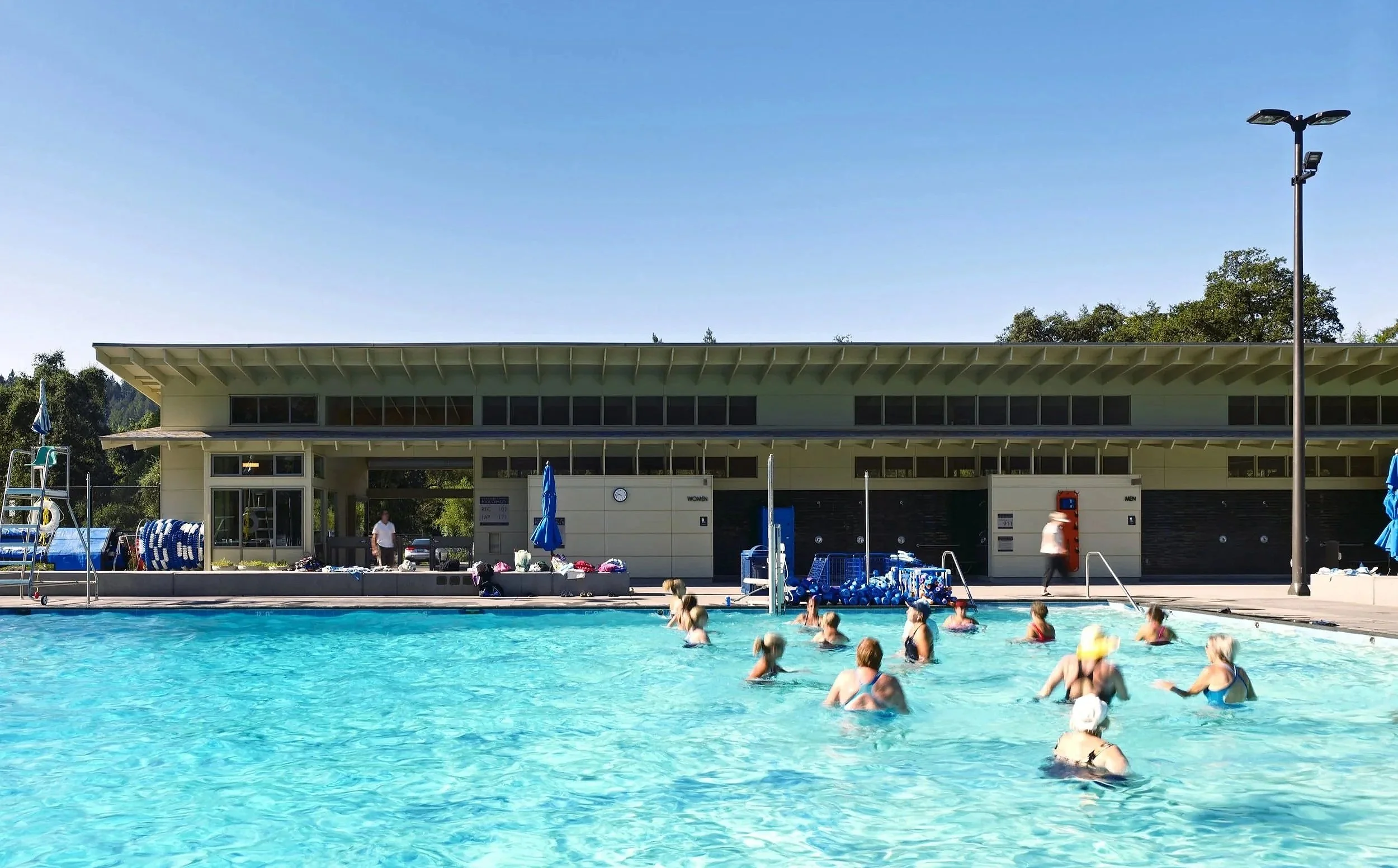 The pools are sited between the new bathhouse and a row of preserved valley oak trees, creating a coherent sense of place.