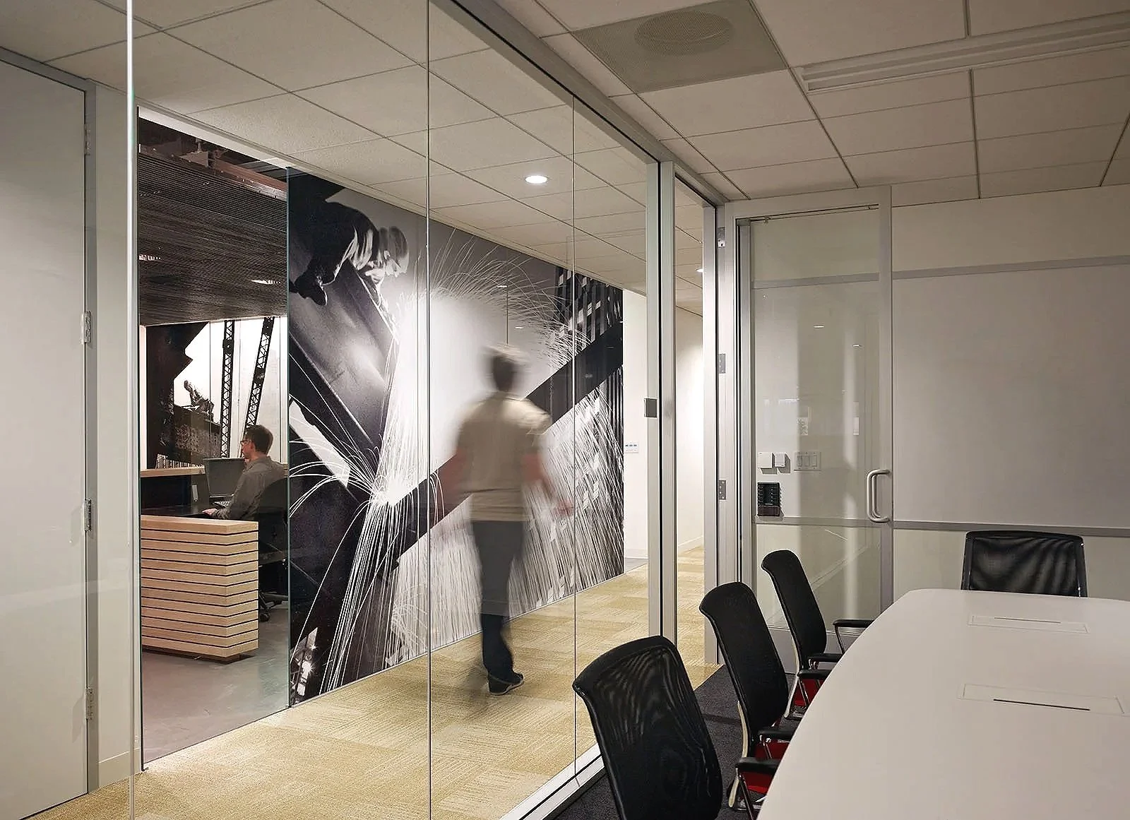 The efficient, open floor plan of 11,400 square feet responded to this brief. Perimeter offices, defined by floor to ceiling glass, maximize natural light and afford views of the surrounding Bay Area. A simple layout improves circulation, making communication easier and daily routines more relaxing. And abundant day lighting, low-VOC materials, and certified sustainable custom plywood workstations not only make for a comfortable physical environment but also contribute to the office’s LEED Silver certification. Taken together, these elements combine to create a healthful, warm, and environmentally conscientious workspace.