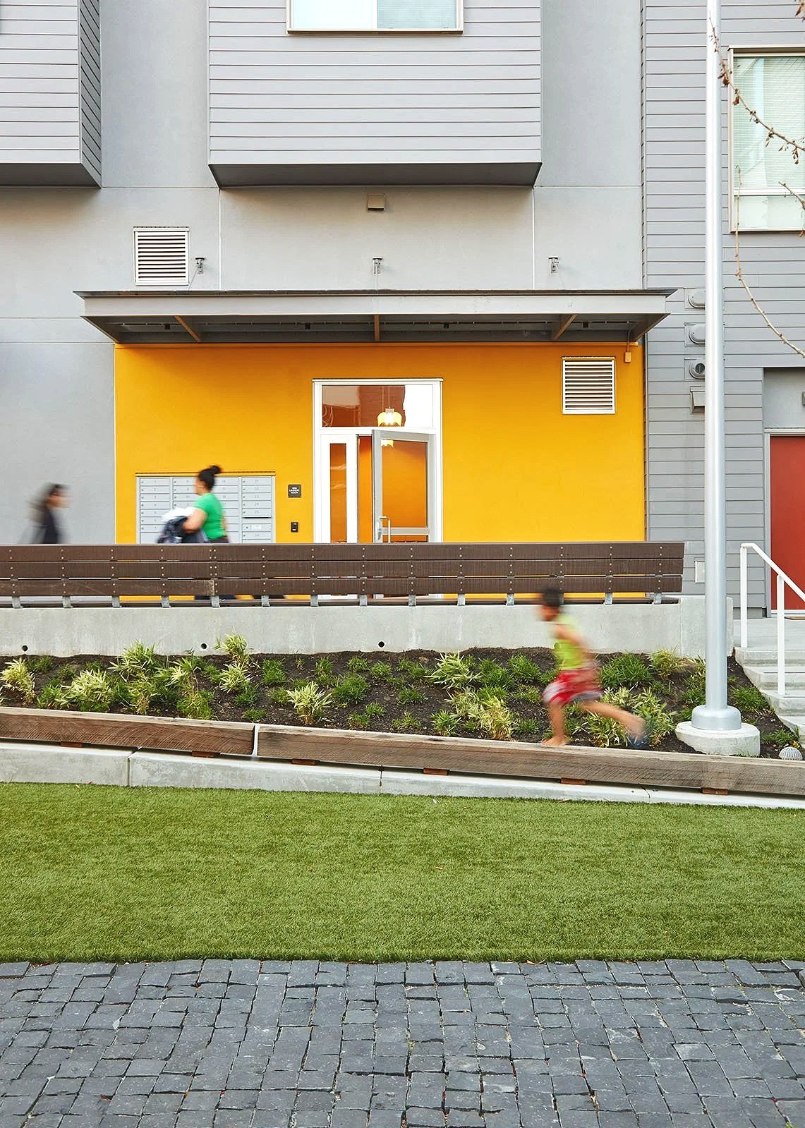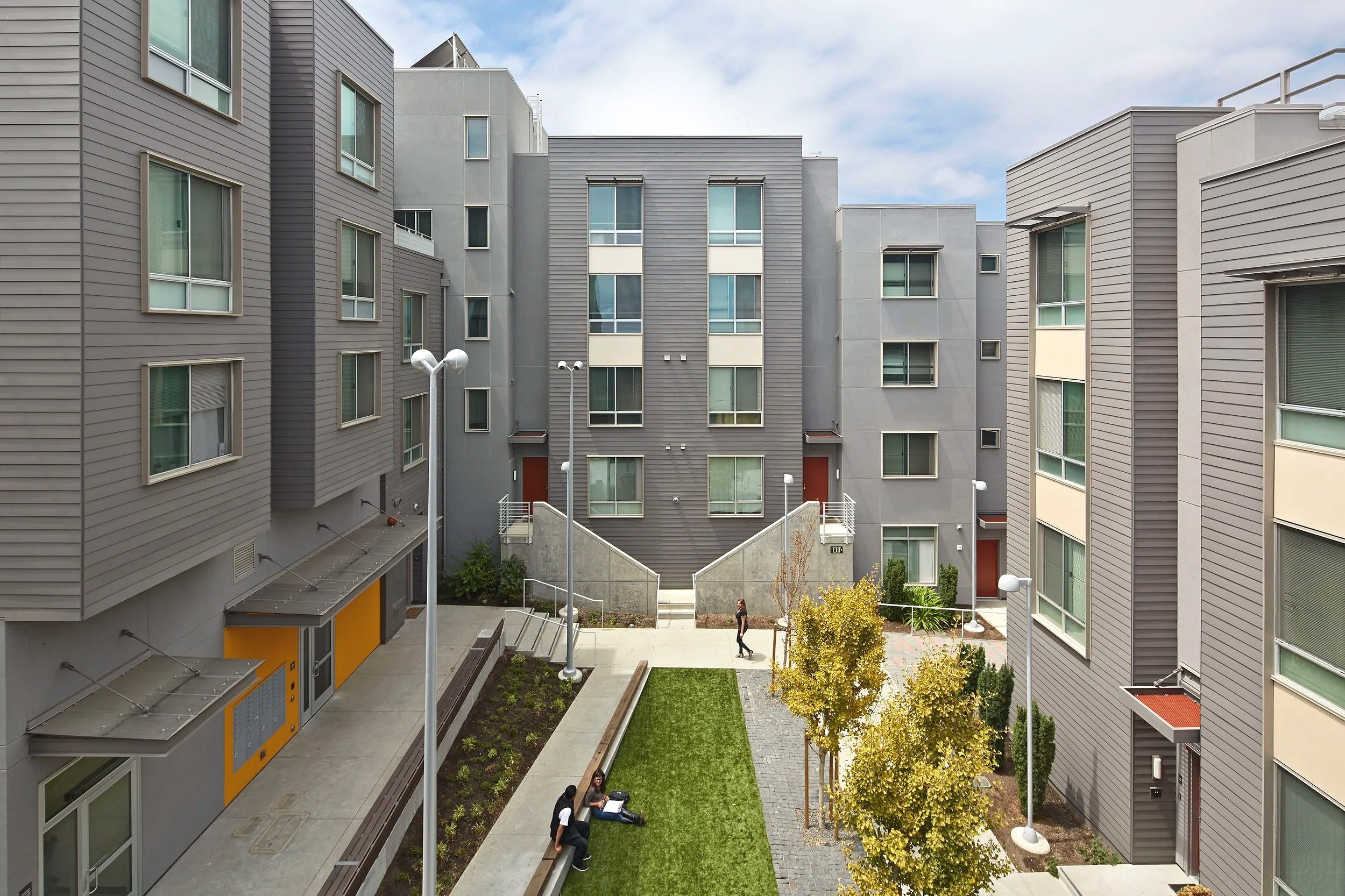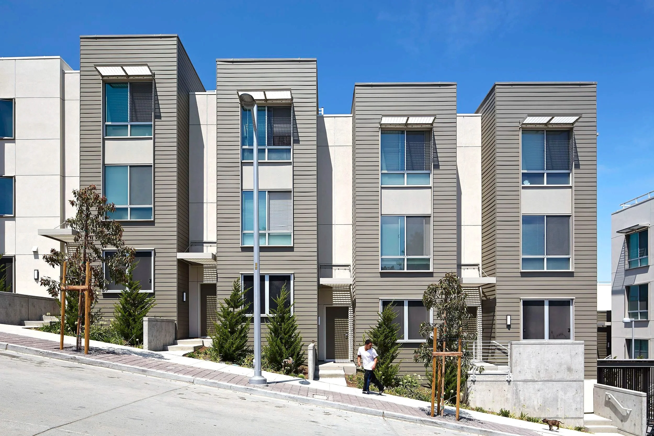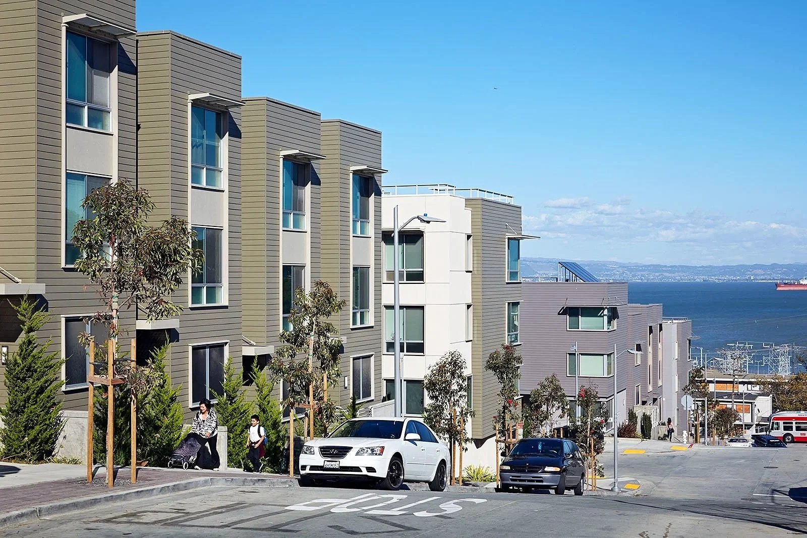 Part of San Francisco’s ambitious HOPE SF program—a plan to revitalize San Francisco’s forgotten low-income neighborhoods—our design for two new blocks of housing at Hunters View provides a mix of affordable and market-rate units. Phased building allowed the existing tenants to remain in the neighborhood, mitigating displacement in this historically neglected area with a history of redlining, disinvestment, and environmental hazards. The buildings themselves are designed as stacked townhomes, stepping down along the streets in patterns typical of traditional San Francisco row housing. Four buildings surround two mid-block courtyards that provide shared and secure open space, contributing to the street life of the neighborhood.