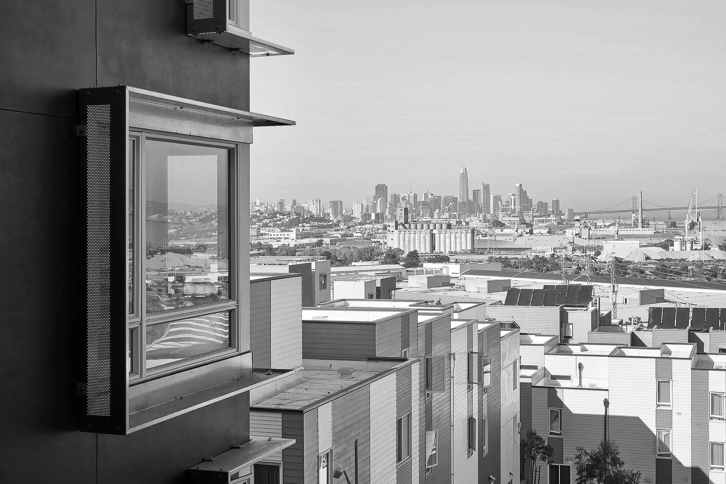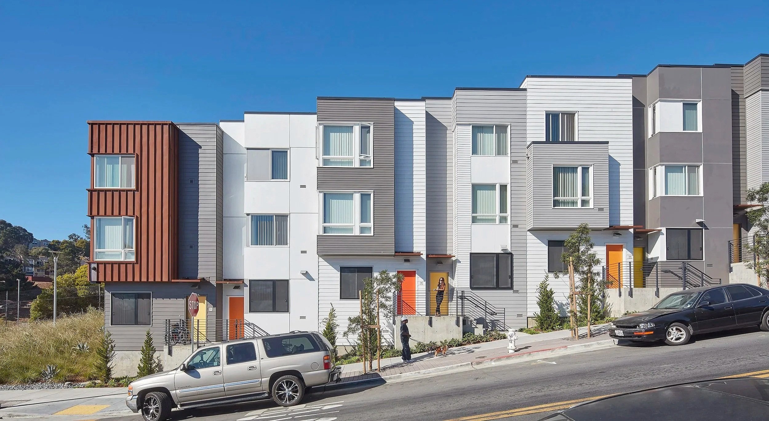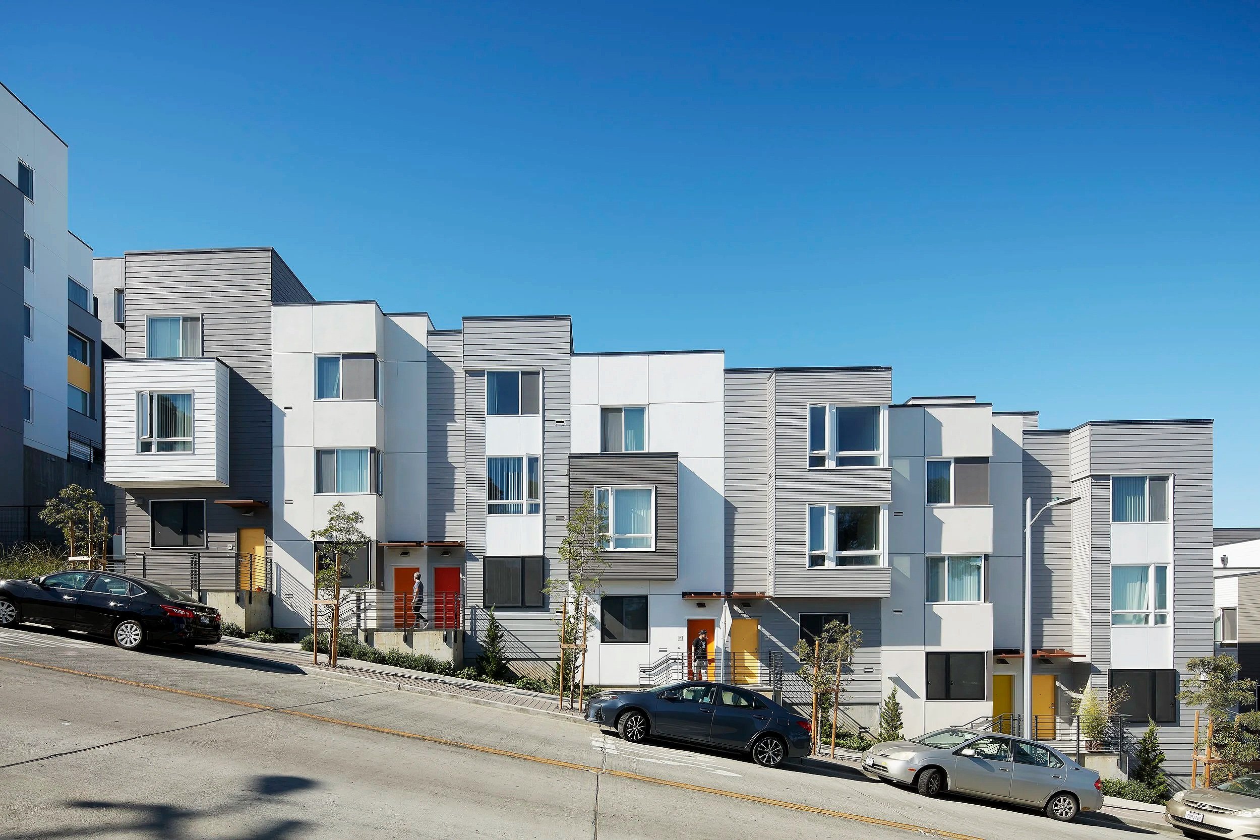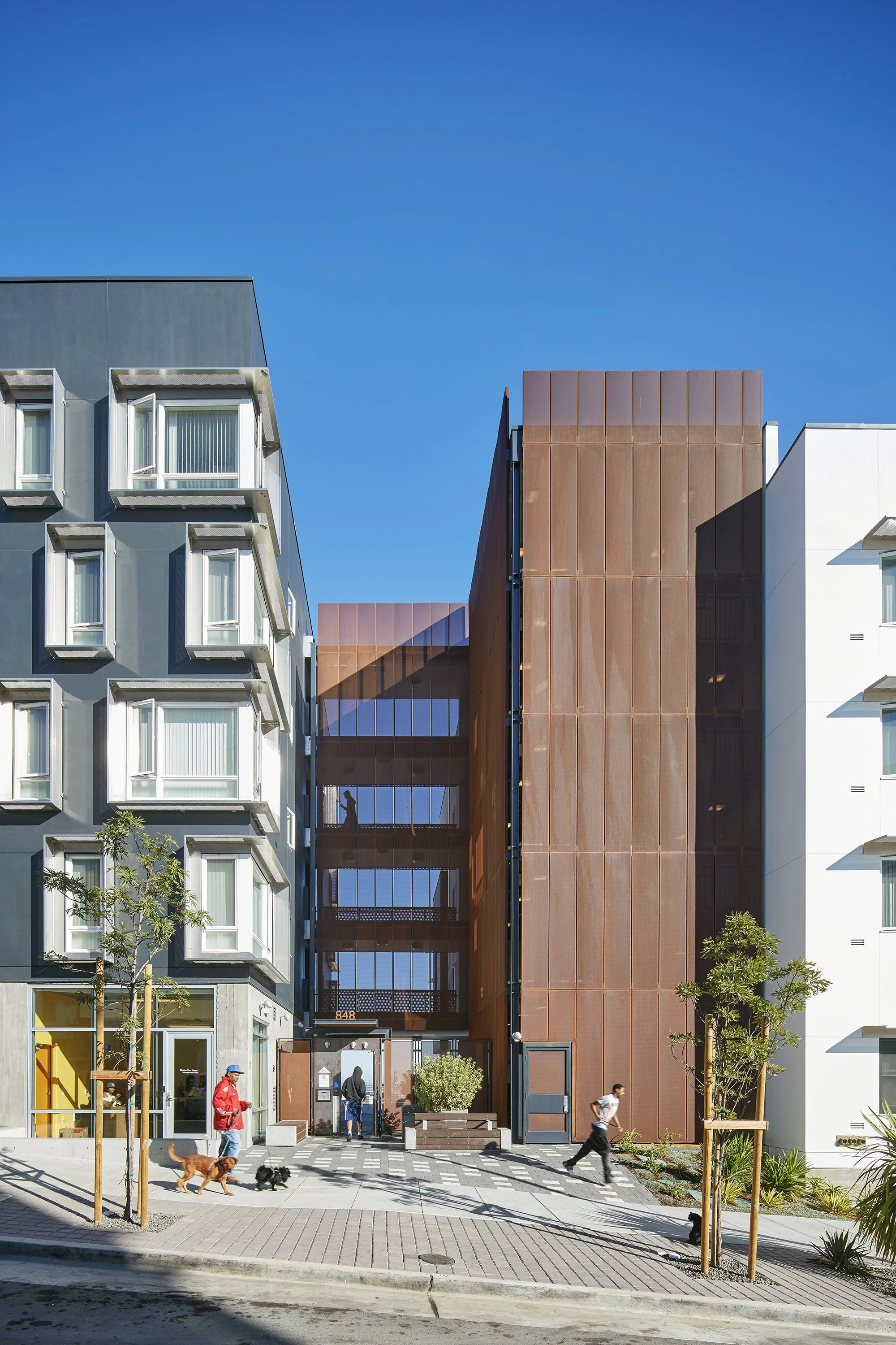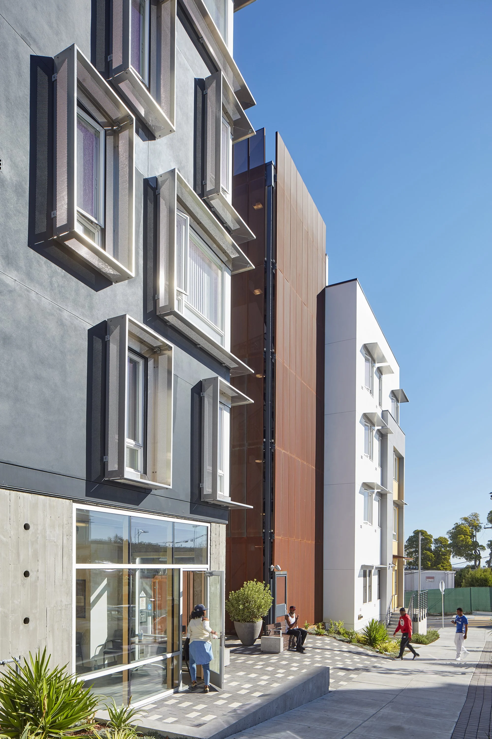 Two accessible, five-story apartment buildings are situated on the most level part of the site along Fairfax Avenue, while row houses step down the steeper adjacent streets. Facades that vary in materiality—broad panels in deep charcoal and white, horizontal siding in a bright gray, and perforated Corten steel panels that create visual depth—come together to form a rich and varied street wall. Taken together, these elements provide a much-needed visual intervention, forging a new identity for the neighborhood and incorporating its visual language into that of the broader city.