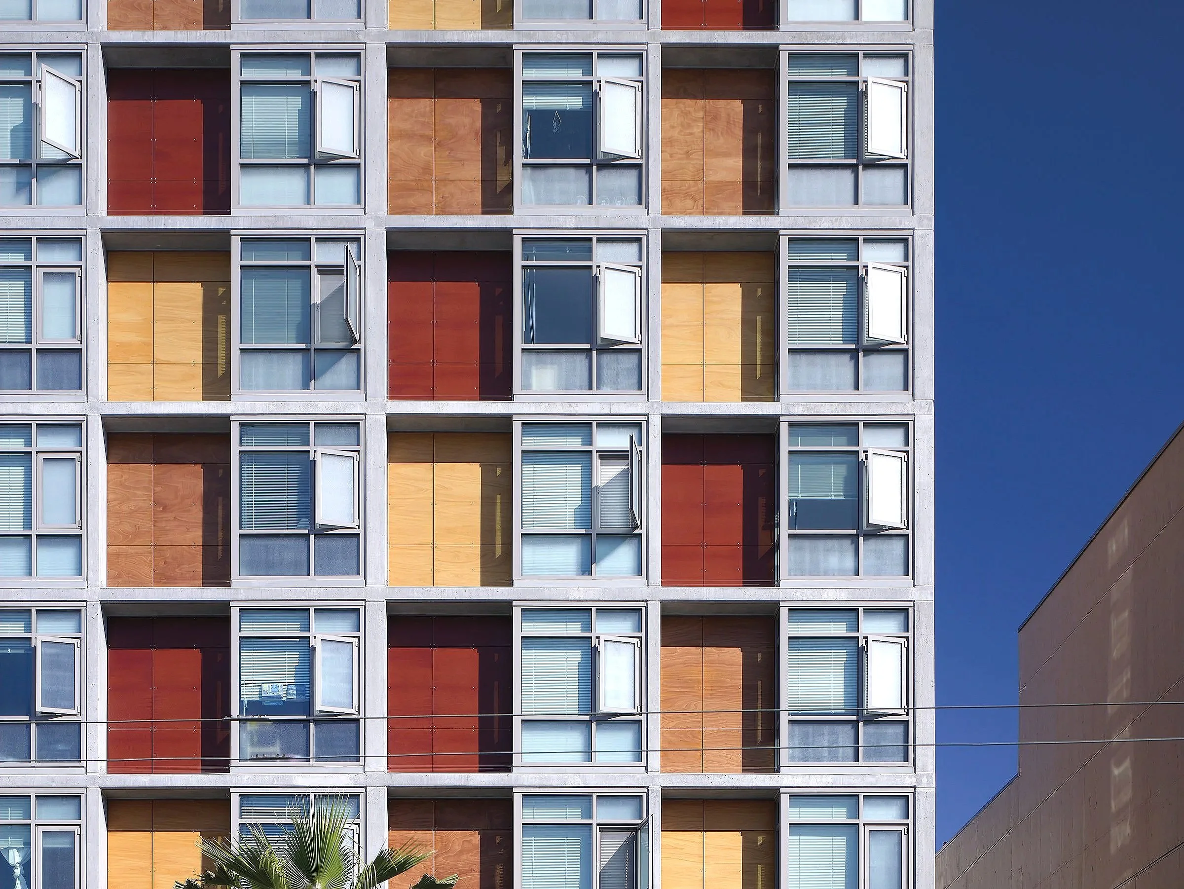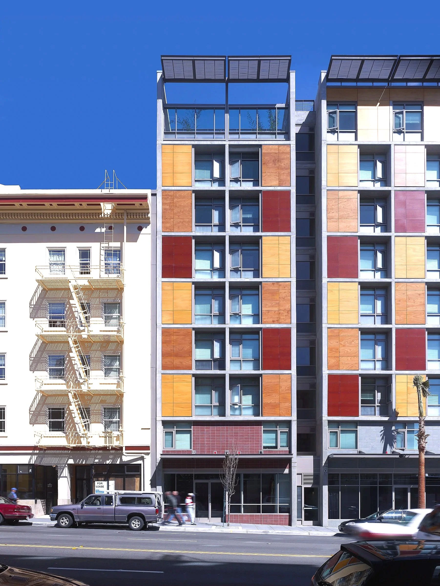 The eight upper floors, arranged into a pinwheel plan around the elevators and stair core, feature corridors with ample natural light and views to the exterior. Within individual units and community spaces, low-VOC and recyclable materials create a healthy environment, particularly important for the building’s vulnerable population. And on the exterior, the concrete structure serves as a gridded framework within which plywood panels in varying colors create a rich and active facade.
