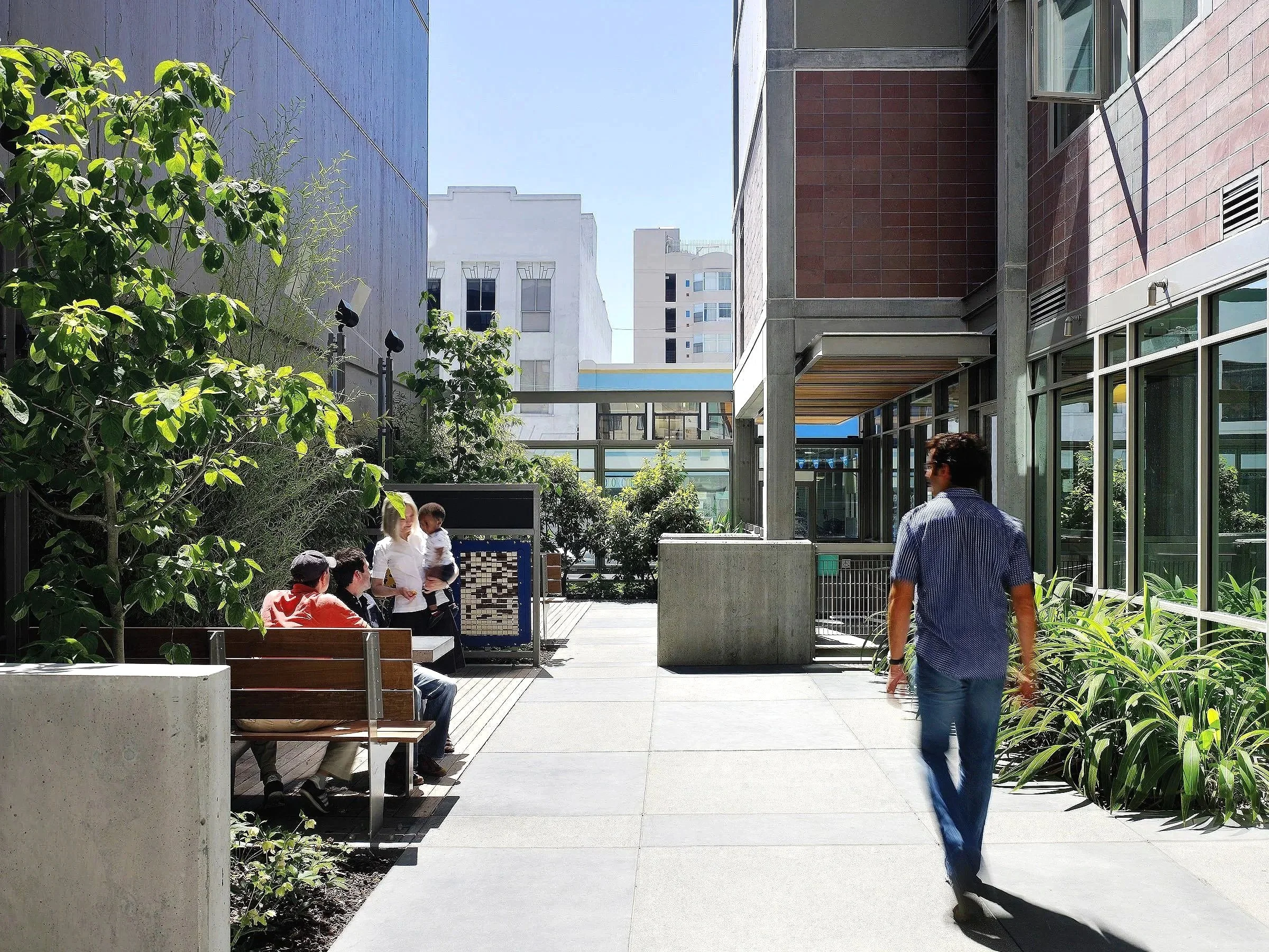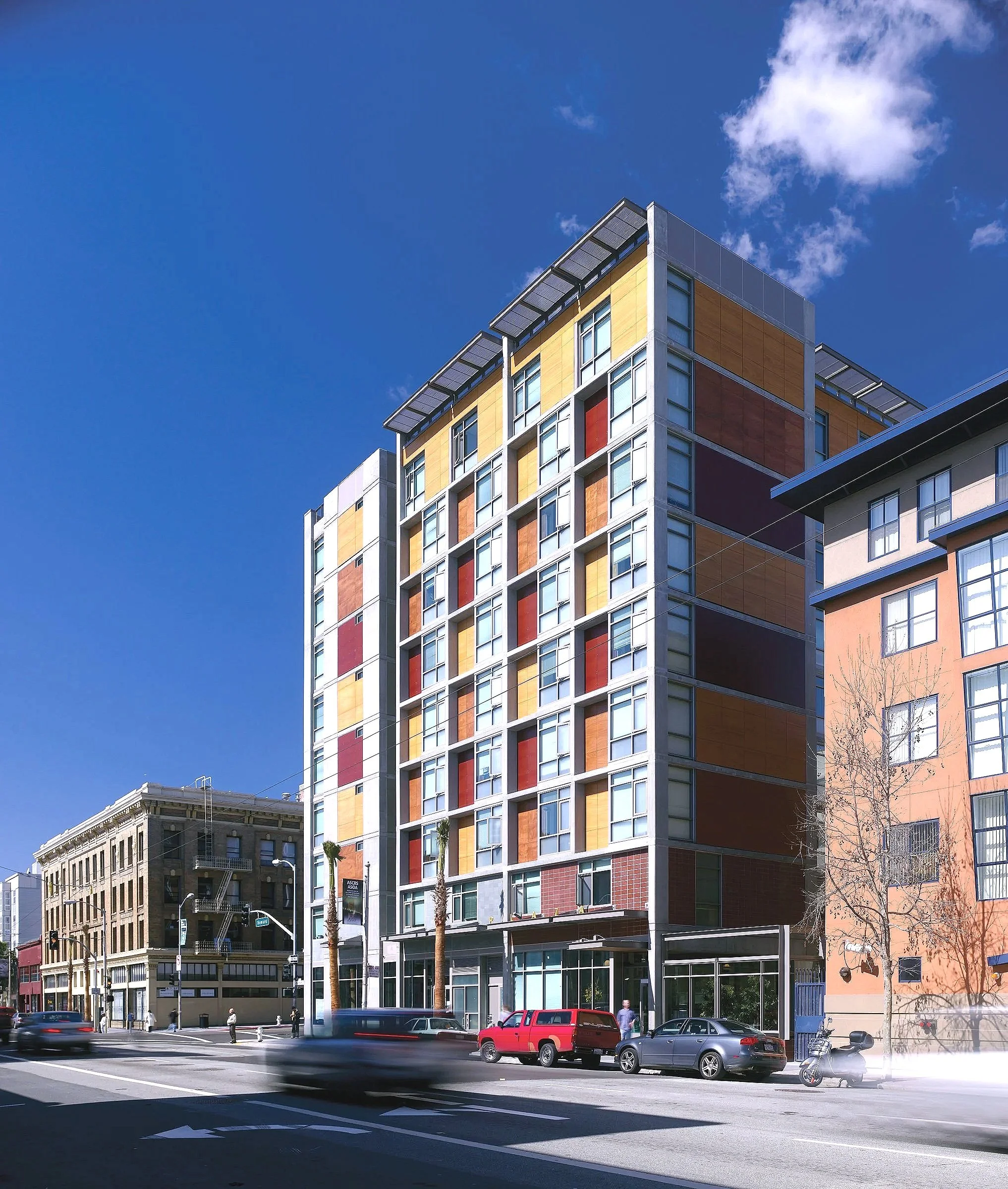 One of the first permanent supportive housing projects in San Francisco, the Plaza Apartments combine retail spaces, a black-box community theater, support services, and amenities for dual-diagnosis residents along with 106 affordable mini-studio apartments.