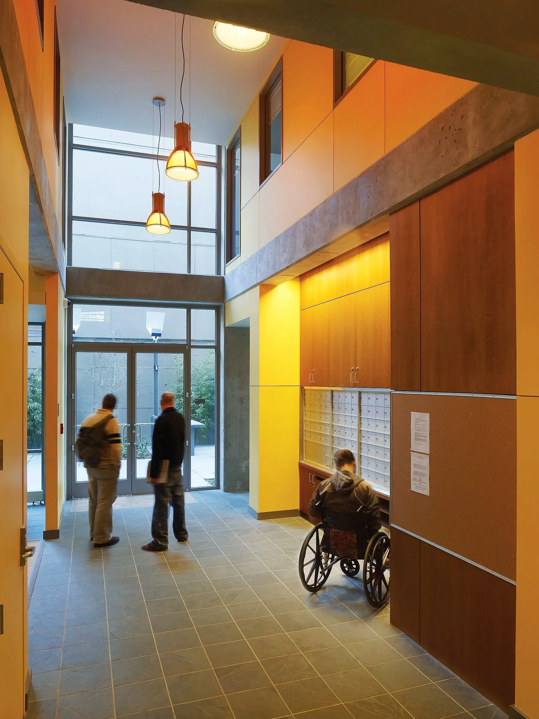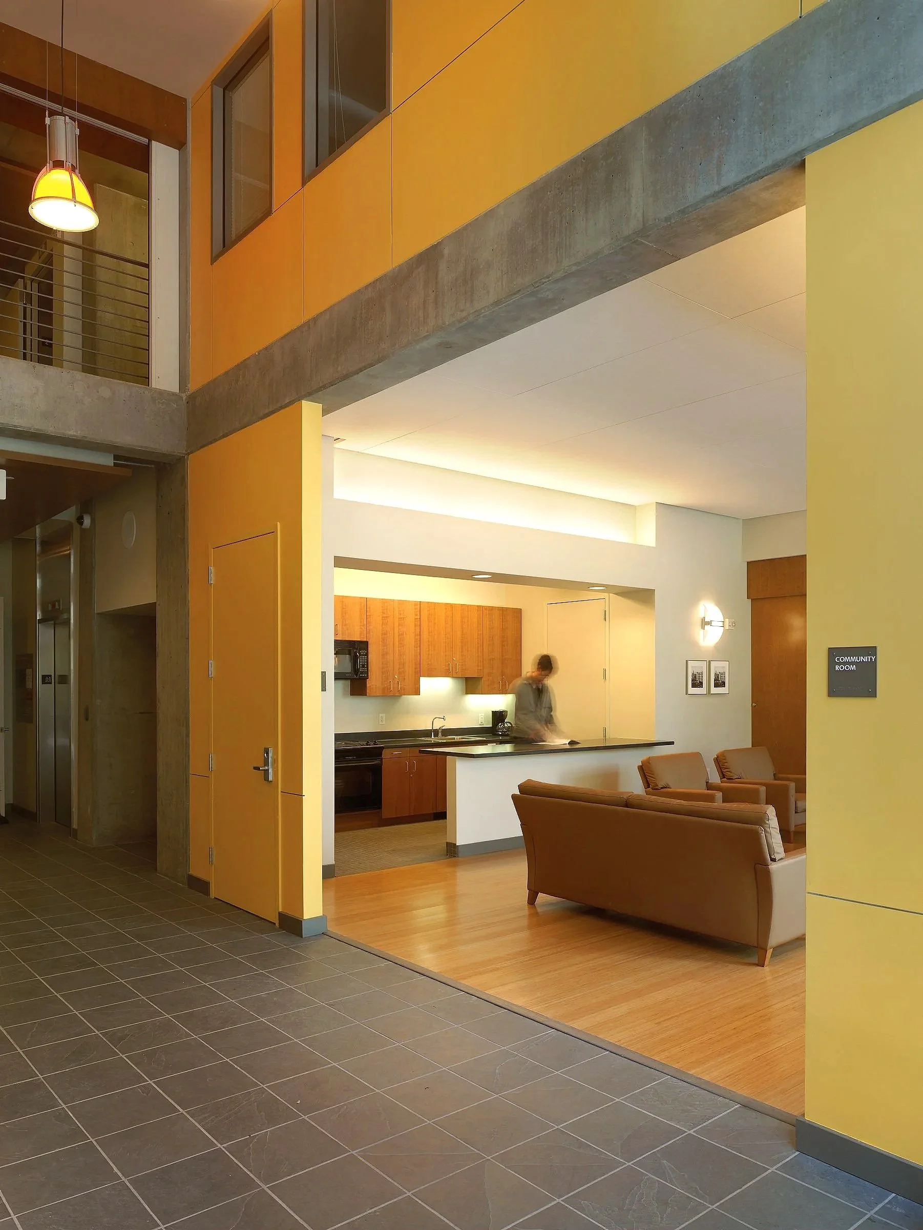 On the ground level, an entry to the theater and retail space along two street fronts engage and encourage foot traffic. The entry lobby and community space open onto a landscaped courtyard to create an active indoor/outdoor space.