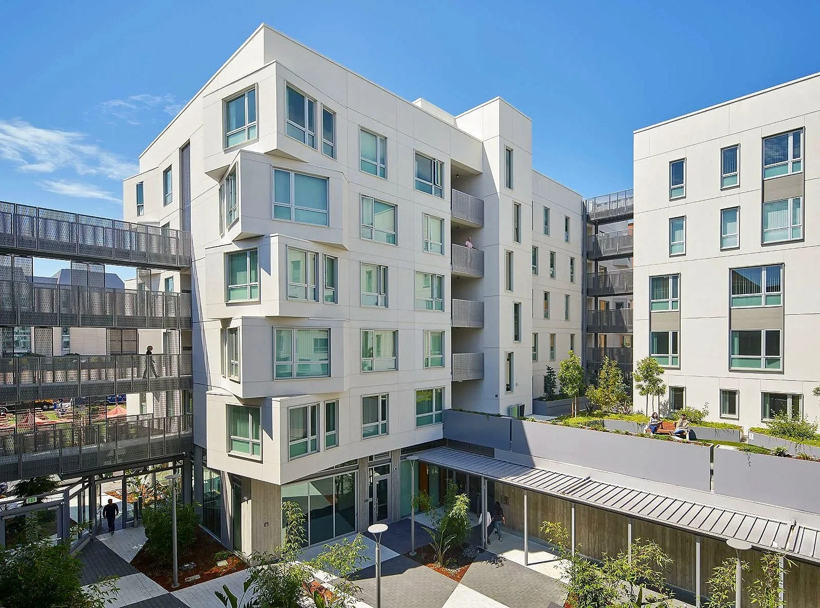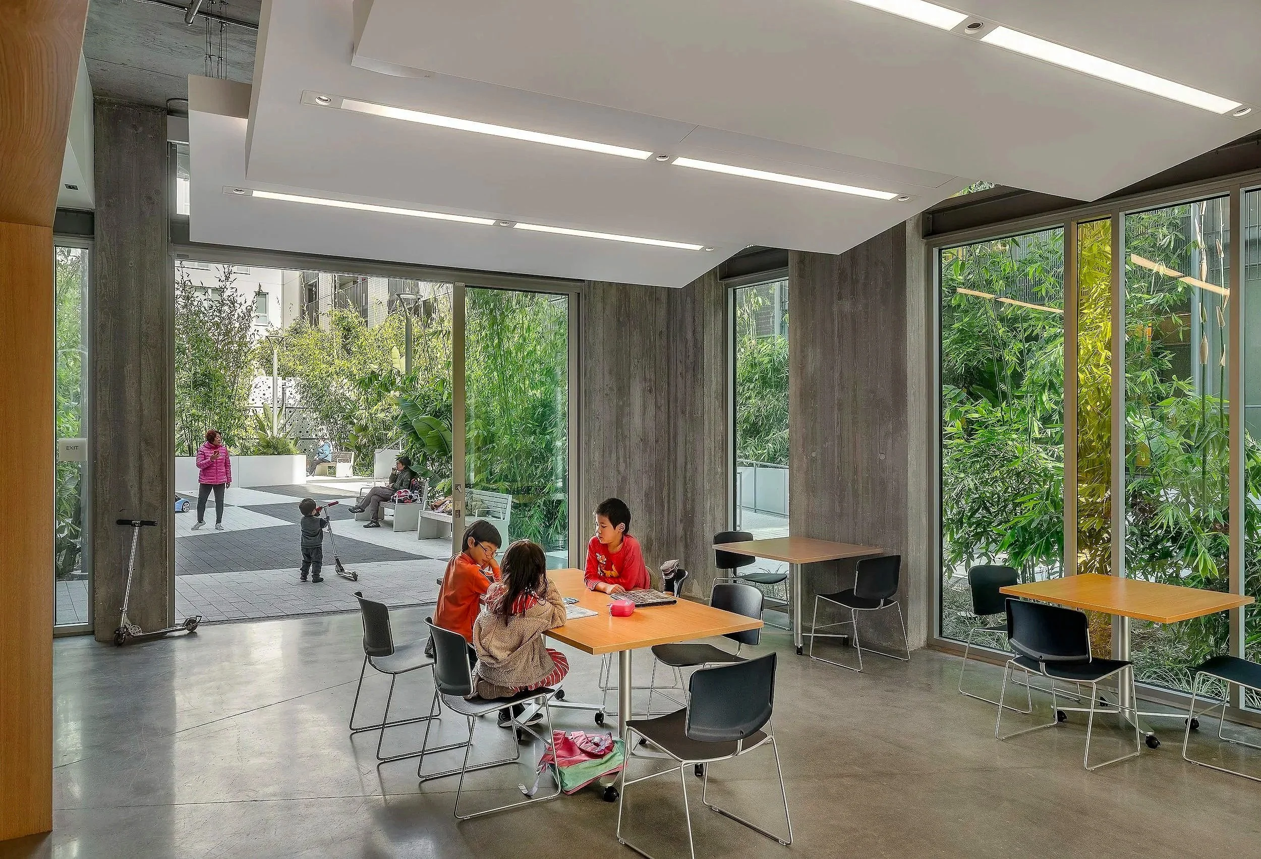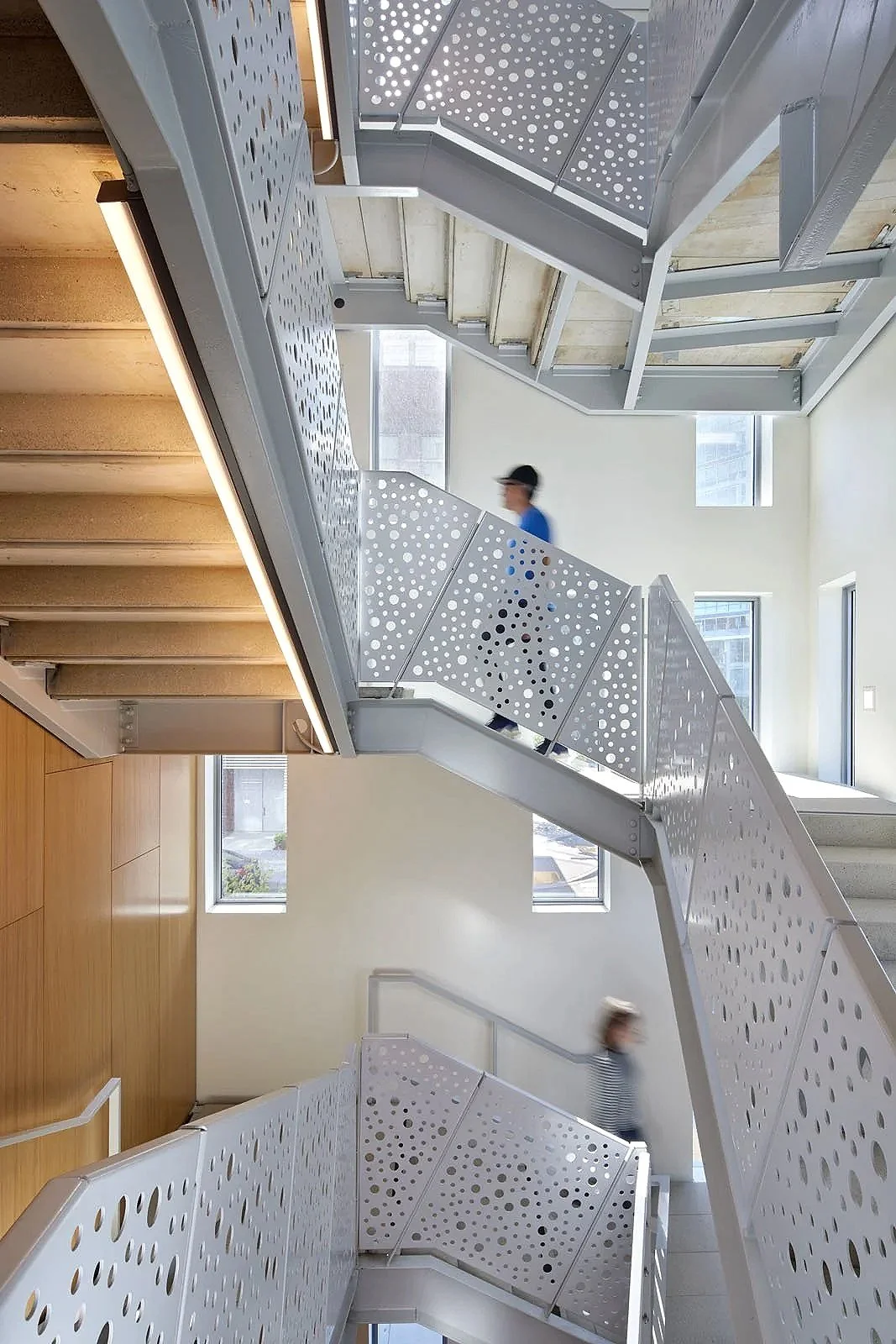 A variety of outdoor spaces throughout offer a range of seating and lush landscaping. On the ground floor, a community room abuts a teen lounge and spills into a courtyard, holding communal space at the heart of the development. At the corner, a stair tower acts as a beacon at the terminus of an urban view corridor, with warm light glowing in the evening through its playful window pattern. Its dynamic, airy interior and privileged views invite residents to use the stairs, encouraging a healthy and active lifestyle.
