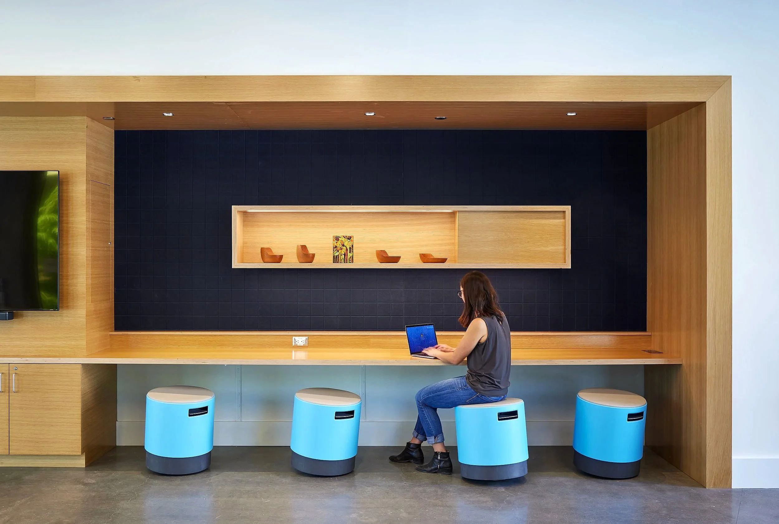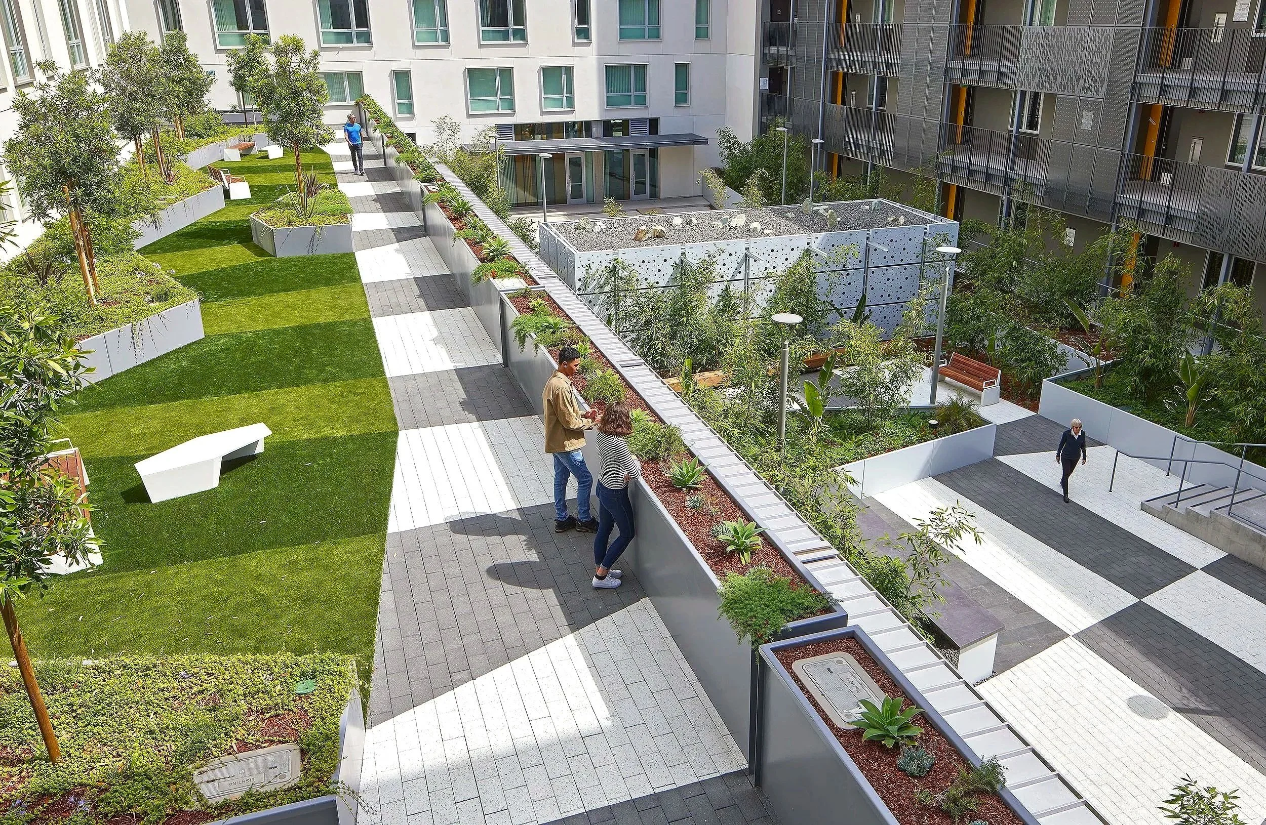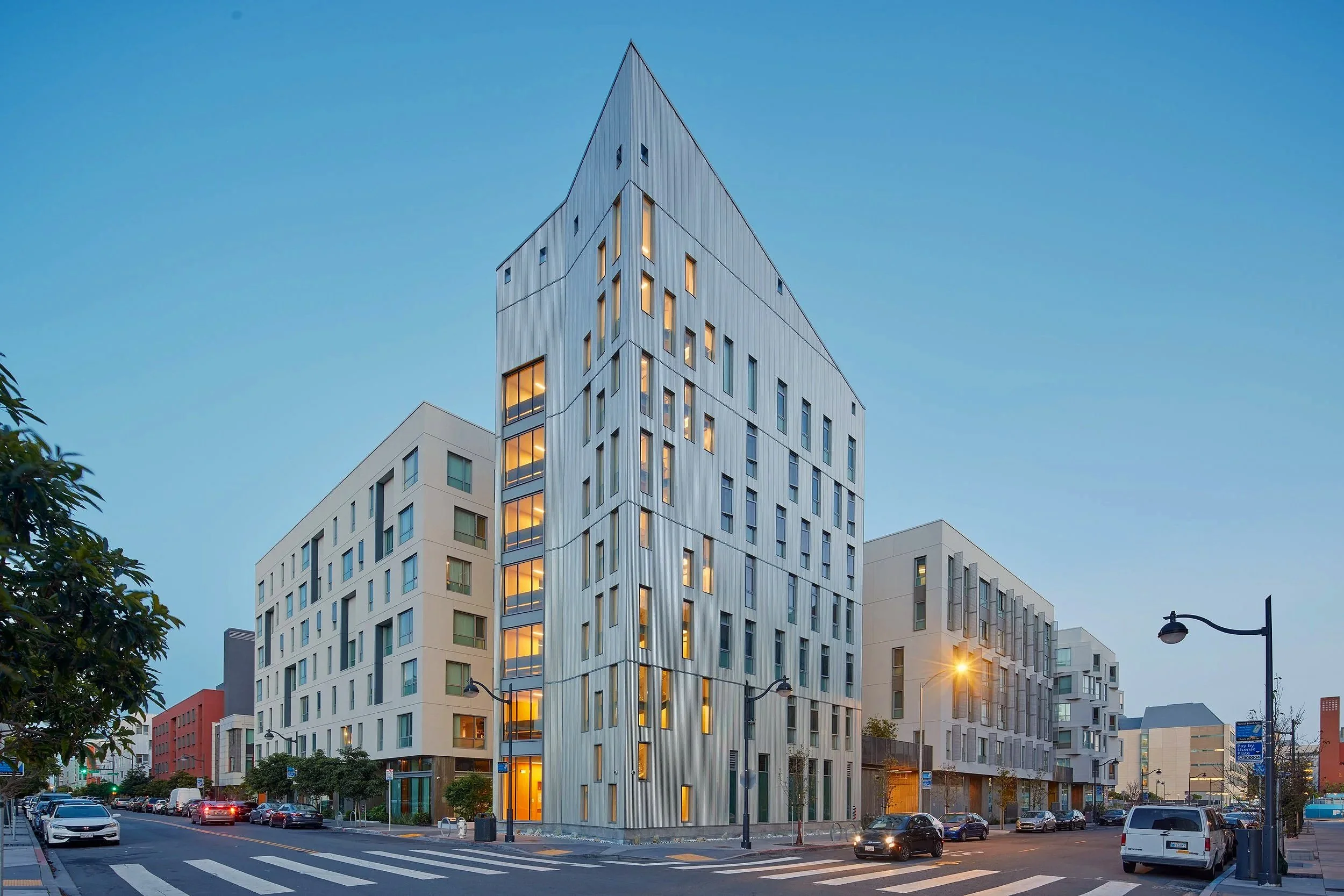 A variety of outdoor spaces throughout offer a range of seating and lush landscaping. On the ground floor, a community room abuts a teen lounge and spills into a courtyard, holding communal space at the heart of the development. At the corner, a stair tower acts as a beacon at the terminus of an urban view corridor, with warm light glowing in the evening through its playful window pattern. Its dynamic, airy interior and privileged views invite residents to use the stairs, encouraging a healthy and active lifestyle.