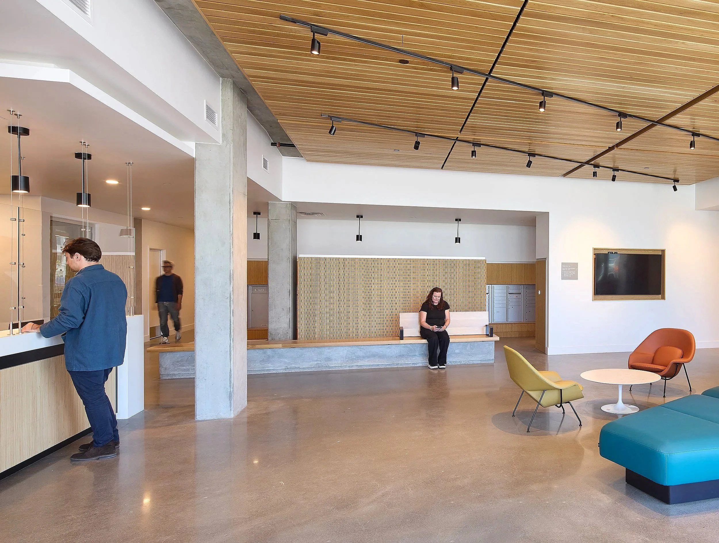 Two wings address the scale of each frontage: along the busy Seven Seas Avenue, the building reaches seven stories, while on the pedestrian and bike–only Shared Public Way it steps down to four stories with ground-level stoops. Between the two, a generously glazed community room faces toward a future park and opens onto a shared courtyard, forming the heart of this vibrant new community.