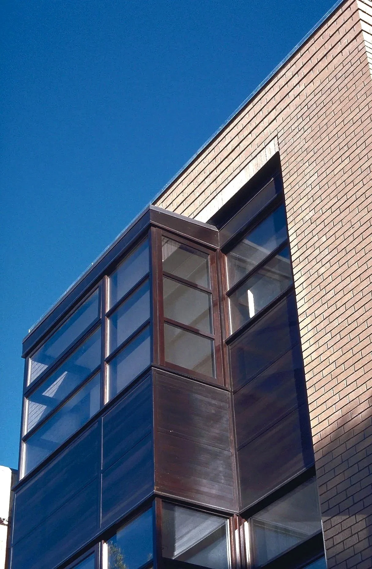 An exterior stair leads from the street to a central courtyard, eventually providing access to each of the four units. Two bays of windows framed in dark wood framed by golden brick comprise the facade in a contemporary yet warm gesture.